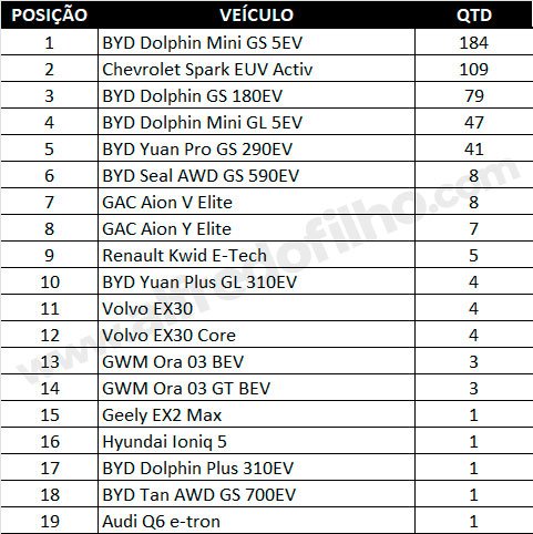 Entre os veículos totalmente elétricos, o destaque ficou para o BYD Dolphin Mini, que liderou com ampla vantagem ao registrar 184 unidades no trimestre. Na segunda colocação aparece o Chevrolet Spark EUV, com 109 veículos, seguido pelo BYD Dolphin, com 79 unidades.