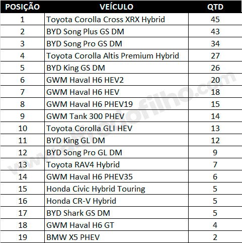 No segmento de híbridos, que somou 360 unidades no trimestre, a liderança ficou com o BYD Song Plus, com 43 emplacamentos, seguido pelo BYD Song Pro, com 34 unidades. O Toyota Corolla Cross aparece na sequência com 45 unidades, considerando a versão híbrida. Modelos da linha Haval H6 também tiveram presença relevante, com versões híbridas e plug-in entre os mais vendidos.