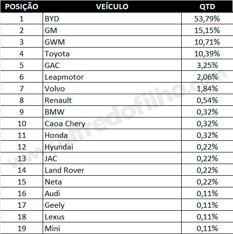 Entre as marcas, a liderança ficou com a BYD, que concentrou 53,79% das vendas de eletrificados no estado, somando 497 unidades. A segunda posição foi ocupada pela GM, com 15,15% de participação, enquanto a GWM aparece na sequência com 10,71%.