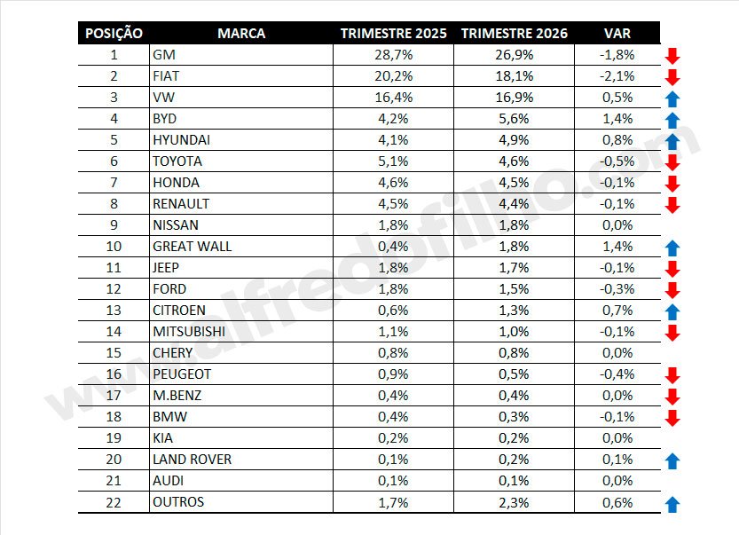 A Volkswagen fecha o top 3 com 16,9% de participação e é a única entre as três primeiras a crescer, com ganho de 0,5% sobre 2025.