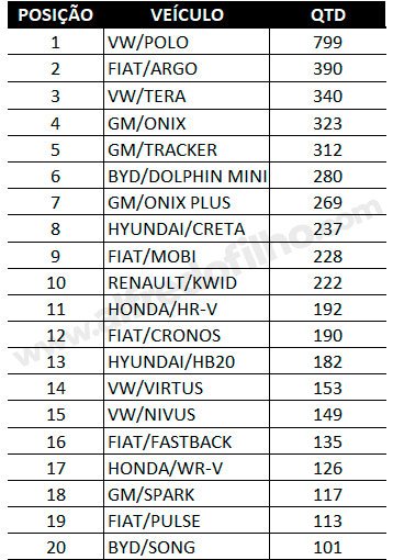 Entre os automóveis de passeio, o Volkswagen Polo liderou o ranking com 799 unidades emplacadas. Na sequência aparecem o Fiat Argo, com 390 unidades, e o BYD Dolphin Mini, com 340 veículos vendidos.