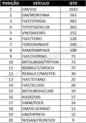 Entre os comerciais leves, a Chevrolet S10 liderou com folga, somando 1032 unidades emplacadas no estado. A Chevrolet Montana ficou na segunda posição, com 563 unidades, seguida pela Fiat Strada, que registrou 483 veículos vendidos.