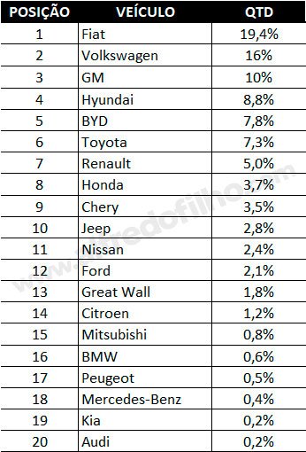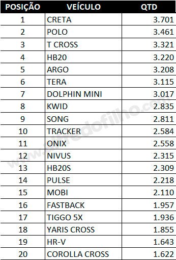 Entre os automóveis, o Hyundai Creta liderou o ranking, com 3.701 unidades vendidas. O Volkswagen Polo aparece na segunda posição, com 3.461 emplacamentos, seguido pelo Volkswagen T-Cross, que fechou o pódio com 3.321 unidades.