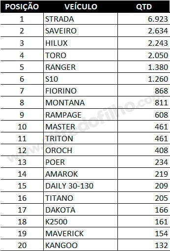 Entre os comerciais leves, a Fiat Strada manteve a liderança absoluta do mercado, com 6.923 unidades emplacadas. A Volkswagen Saveiro aparece na segunda posição, com 2.634 unidades, seguida pela Toyota Hilux, que assumiu o terceiro lugar com 2.243 veículos vendidos.