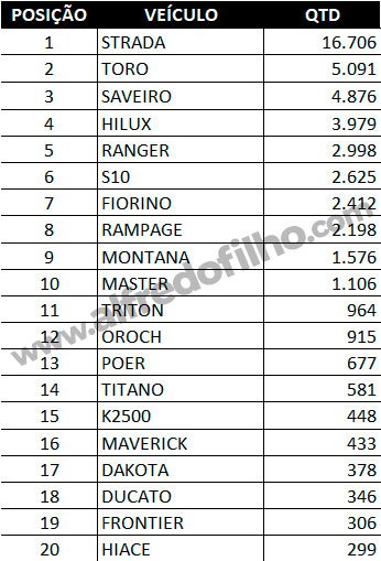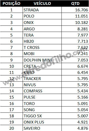 A Fiat Strada liderou o ranking de veículos mais vendidos, com 16.706 unidades emplacadas. Em seguida, o Volkswagen Polo garantiu a segunda posição, com 11.051 veículos emplacados. O Chevrolet Onix ocupou o terceiro lugar, com 10.182 unidades.