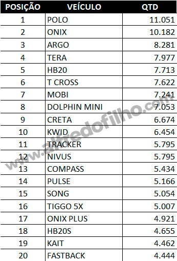 O Volkswagen Polo liderou as vendas com 11.051 unidades emplacadas. Em seguida, o Chevrolet Onix garantiu a segunda posição, com 10.182 veículos. O Fiat Argo ocupou o terceiro lugar, com 8.281 unidades.