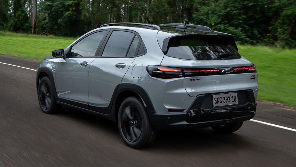 De perfil, o Sonic adota silhueta de cupê, com queda acentuada do teto, reforçando o apelo visual e aspiracional. Com 4,23 metros de comprimento, 1,77 metro de largura e 1,53 metro de altura, o modelo busca equilibrar proporções esportivas e aproveitamento interno. Rodas de 17 polegadas, molduras nas caixas de roda e opções de personalização inspiradas na linha RS ampliam o caráter visual.