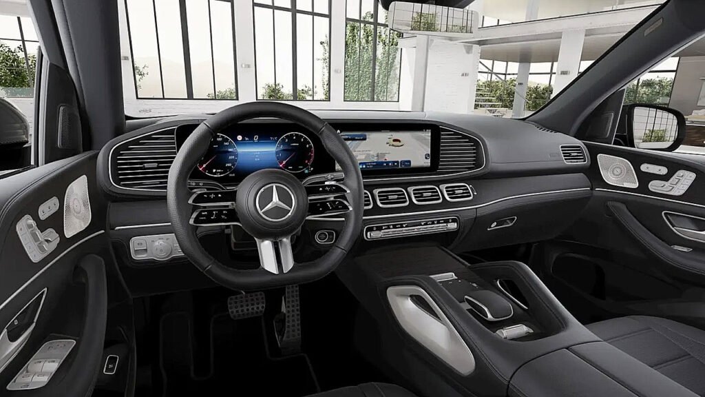 No interior, o GLS 450 prioriza acabamento refinado e conforto para os ocupantes. A cabine conta com apliques em madeira e volante revestido em couro Nappa. Os bancos dianteiros oferecem regulagens elétricas, além de sistemas de aquecimento e climatização. O modelo também traz pacote de aquecimento e conforto e ar-condicionado digital com quatro zonas independentes de temperatura.