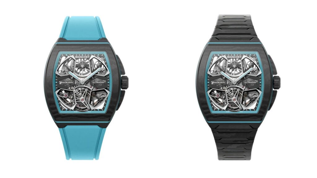 No campo técnico, o relógio utiliza o calibre automático UT01, desenvolvido pela Bianchet, com apenas 3,85 milímetros de espessura. O mecanismo é projetado para suportar impactos de até 5.000 G e conta com uma gaiola de turbilhão em titânio grau 5, característica que evidencia o foco em desempenho e precisão.